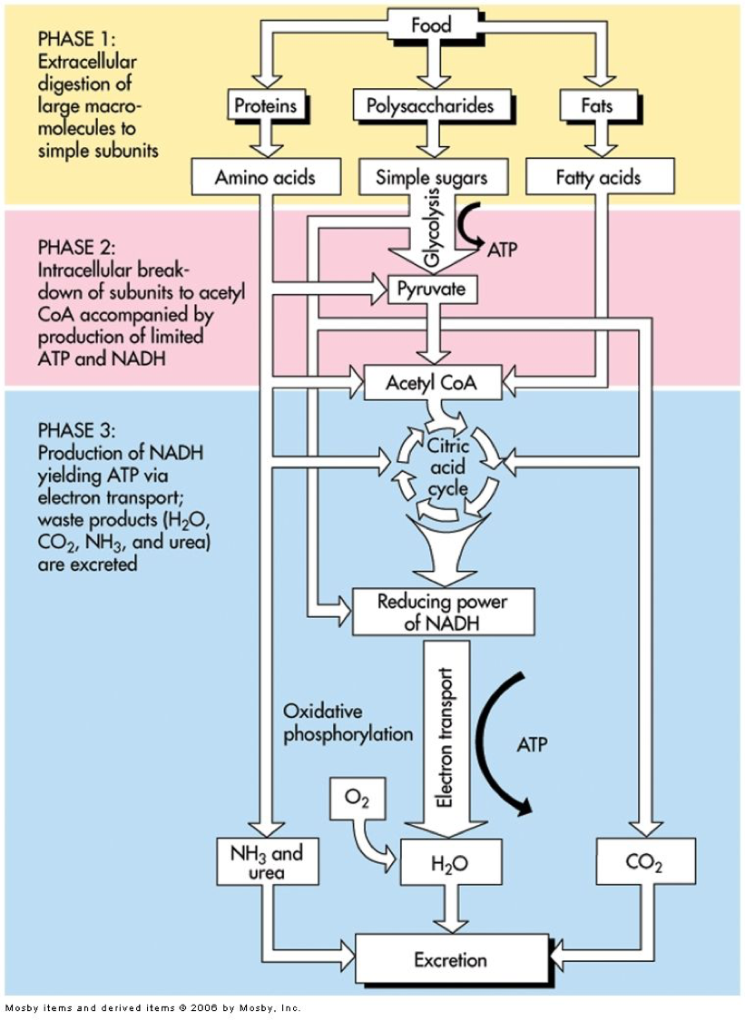 3. Production of NADH yielding ATP via electron transport; waste products (H2O, CO2, NH3, and urea) are excreted