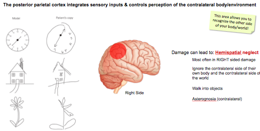 Describe the injury presentation if there is damage to the posterior parietal cortex?