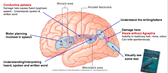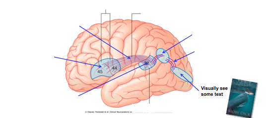 Fill in the blanks and explain the neural pathway from seeing text and explaining what is says