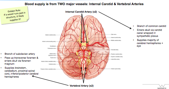 What are the two main blood vessels that supply the brain?