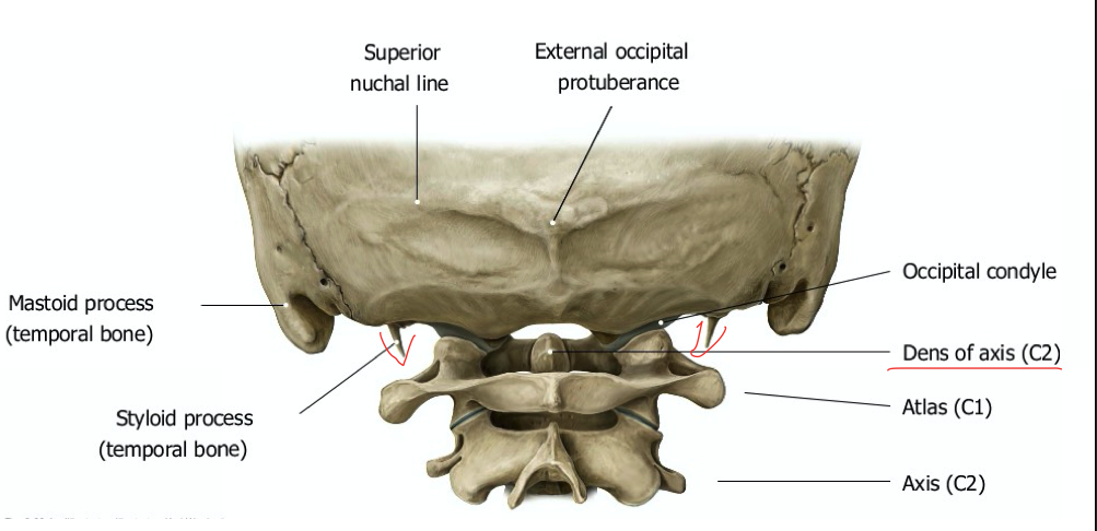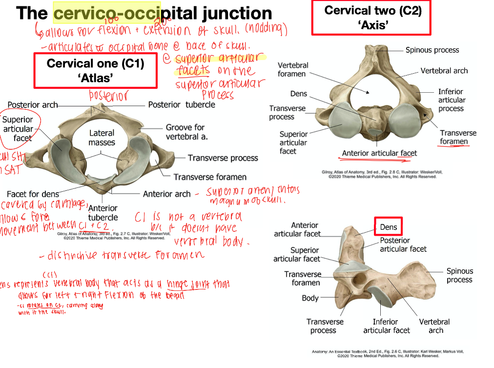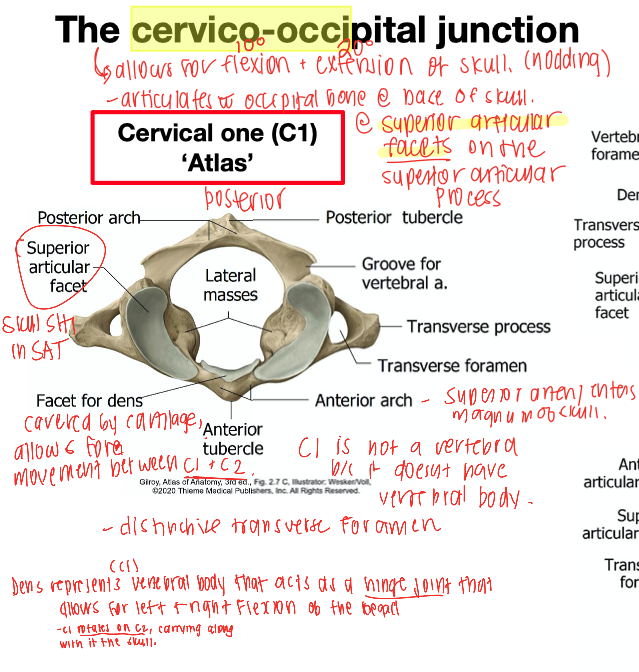 C1 articulates articulates with the occipital bone of the skull at the supeiror articular facets. this allows for a yes/nodding movement.