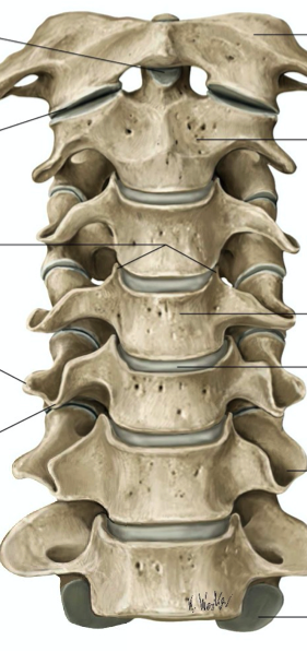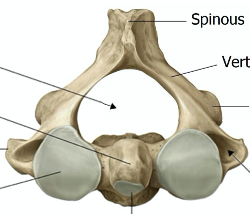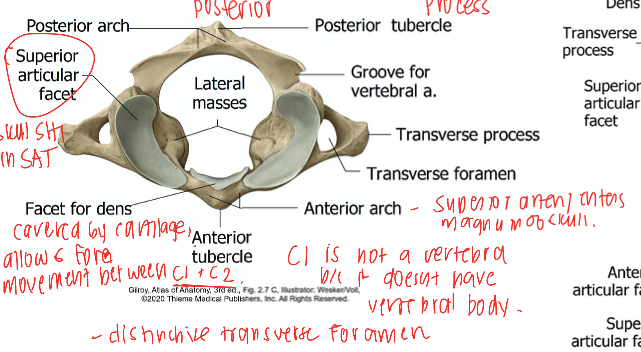 C1 is distinctive because it does not have a vertebral body. is also has a distinc transver process and foramen.