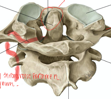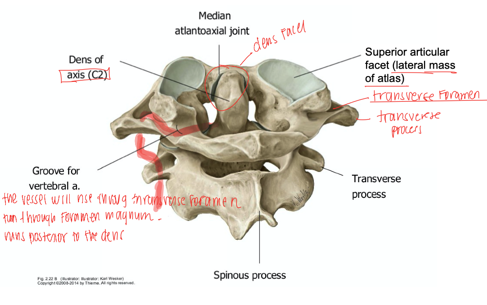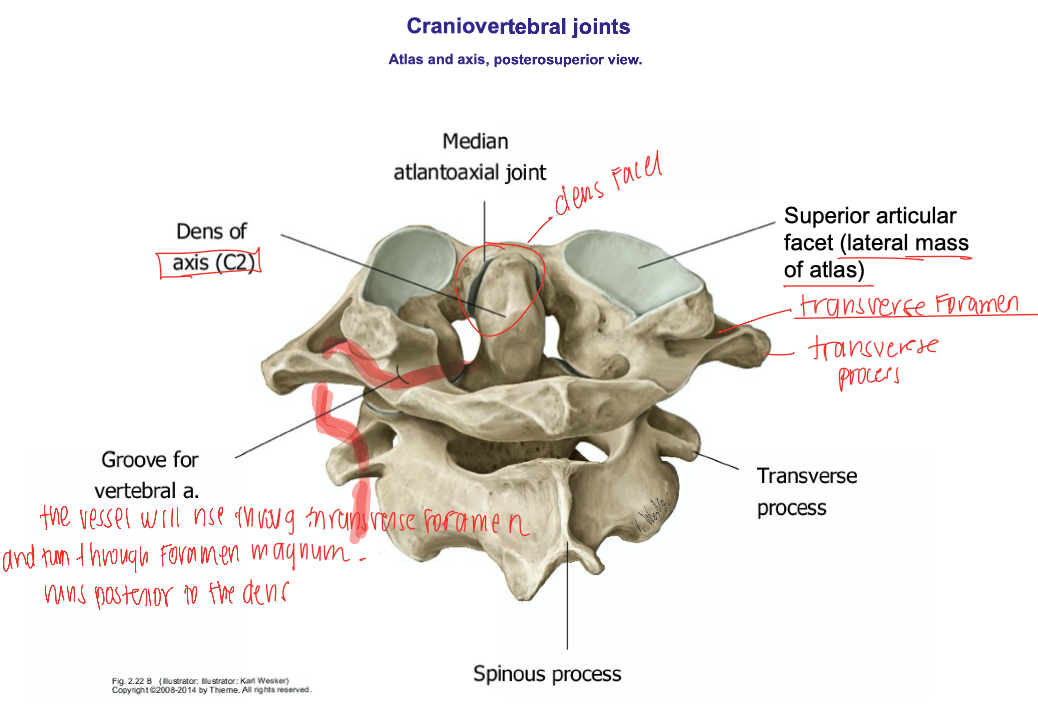 the vertebral artery goes through the transver foramena and turns into the groove to make it’s way into the foramen magnum.