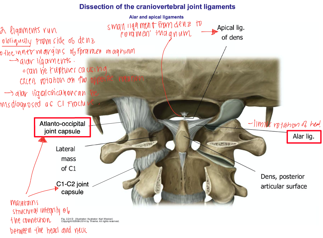two ligaements run obliquely form the side of the dens to the left and right inner margein of the foramen magnum. the alar ligaments limit rotation of the head.