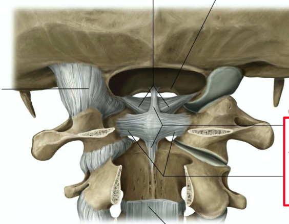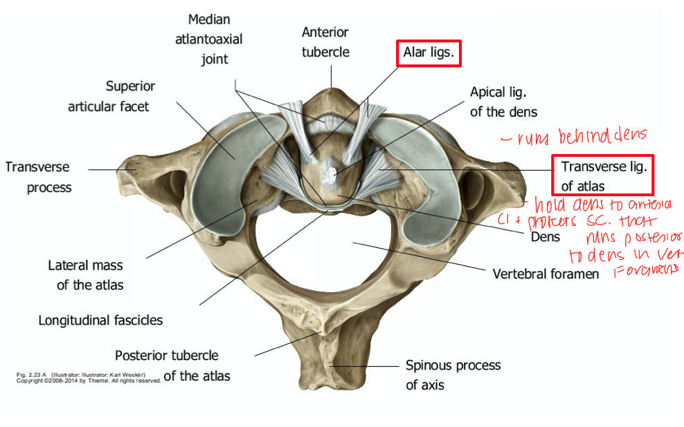 the transnverse ligament of the atlas forms a band that runs behind the dens. the ligaments holds the dens on the anterior portion of the C1 and protects the spinal cord.