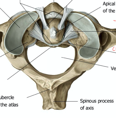 the ligament from tip of dens to anterior foramen magnum called the apical ligament of the dens contributes very little to the stability of the joints
