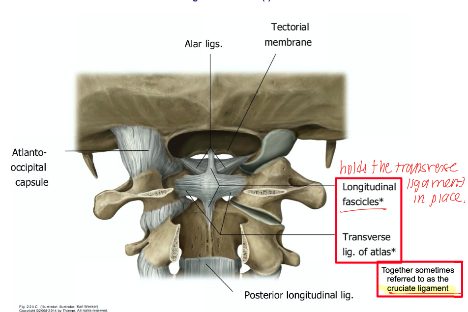 the alar ligaemnts are behind the transverse ligament. the transverse ligament is helad in place by superior and intferior longitudianl fasciles. they are sometimes referred to as the cruciate ligament of the atlas.