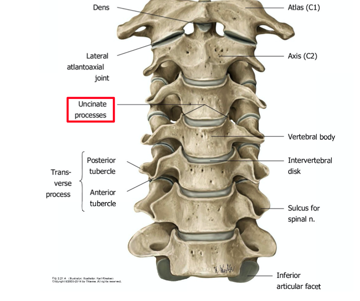 uncovertebral joints are specific to the last 5 cervical vertebrae. they appear with age. the uncovertebral joint forms where a lip forms of the superior surface of the vertebrae body. often associated with degredataion with age.