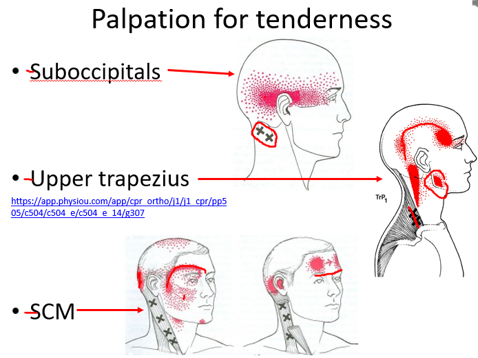 * Neck muscle tenderness and tone (Usually TrP tenderness of Suboccipitals, Upper Trap, Levator, SCM