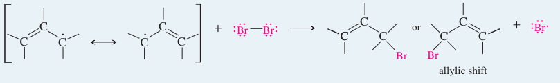 In one of the products of allylic bromination (used as an example of any halogenation), the bromine atom appears in the same position where the hydrogen atom was abstracted. The other product results from reaction at the carbon atom that bears the radical in the second resonance form of the allylic radical. This second compound is said to be the product of an allylic shift.