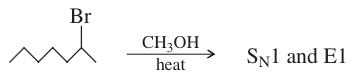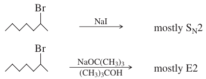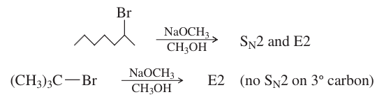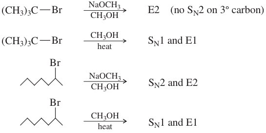 Tertiary halides usually undergo the E2 reaction (strong base) or a mixture of SN1 and E1 (weak base). Tertiary halides cannot undergo the SN2 reaction. A strong base forces second-order kinet- ics, resulting in elimination by the E2 mechanism. In the absence of a strong base, terti- ary halides react by first-order processes, usually a mixture of SN1 and E1. The specific reaction conditions determine the ratio of substitution to elimination.