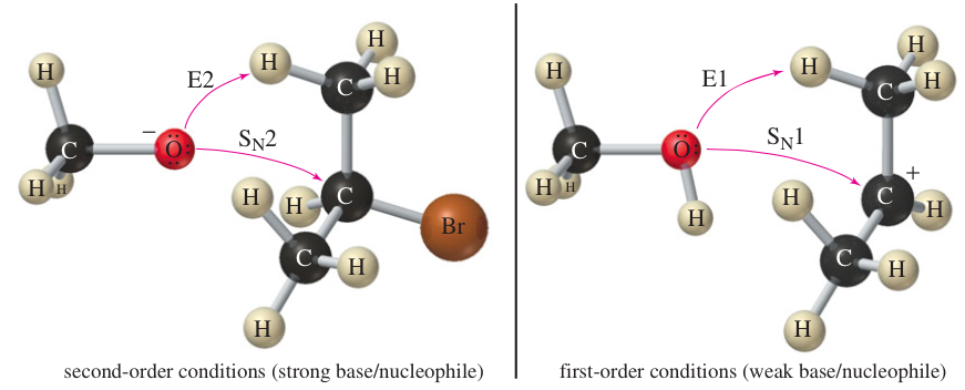 The strength of the base or nucleophile determines the order of the reaction. If no strong base or nucleophile is present, the fastest reaction will probably be a first- order reaction, either SN1 or E1. Addition of silver salts to the reaction can force some difficult ionizations.