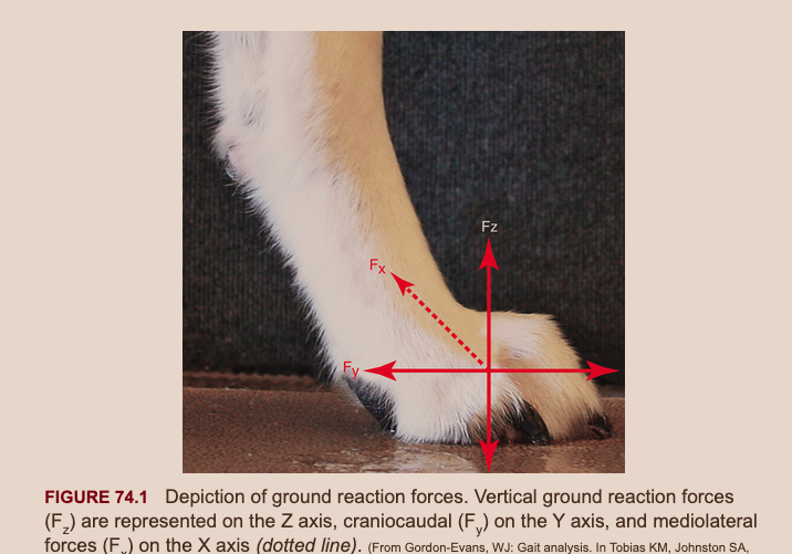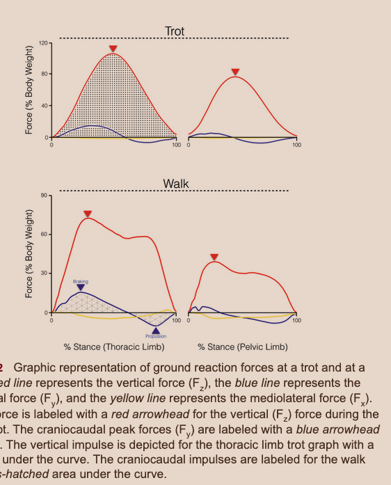 The direction of force is most commonly described, Fx (mediolateral), Fy (craniocaudal), Fz (vertical) with the vertical force Fz being most common