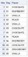 The SORT procedure sorts the data Cert.Choices by the variable Day first, then Flavor in ascending order, and finally writes the sorted data set to Work.Choices.