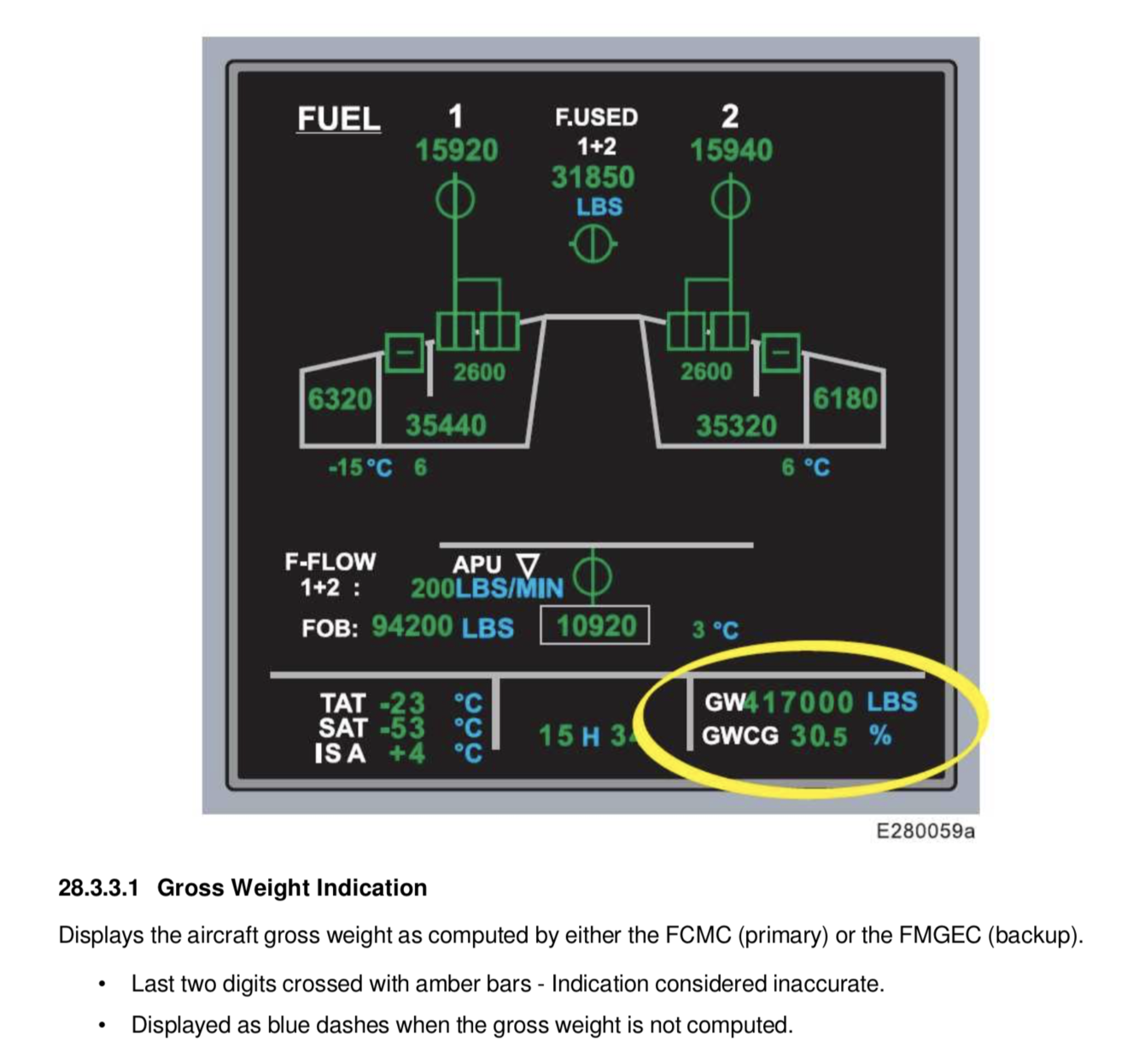Displays the aircraft gross weight as computed by either the FCMC (primary) or the FMGEC (backup).