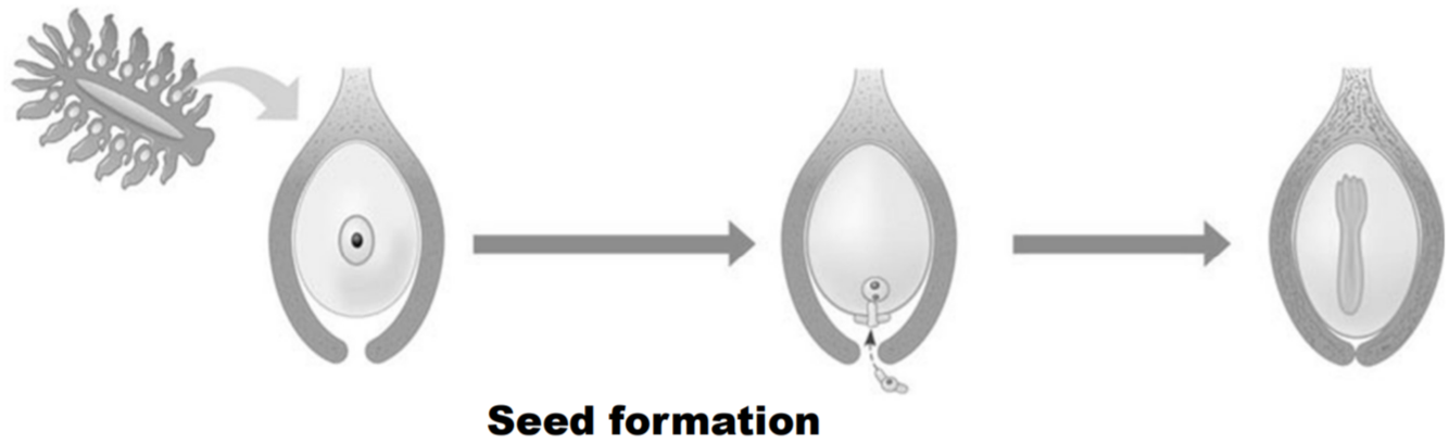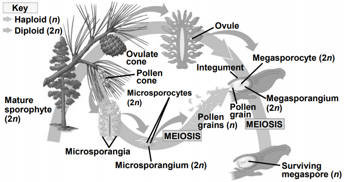 After germination and fertilization, a gymnosperm ovule develops into a seed which consists of the sporophyte embryo, its food source, and a protective coat
