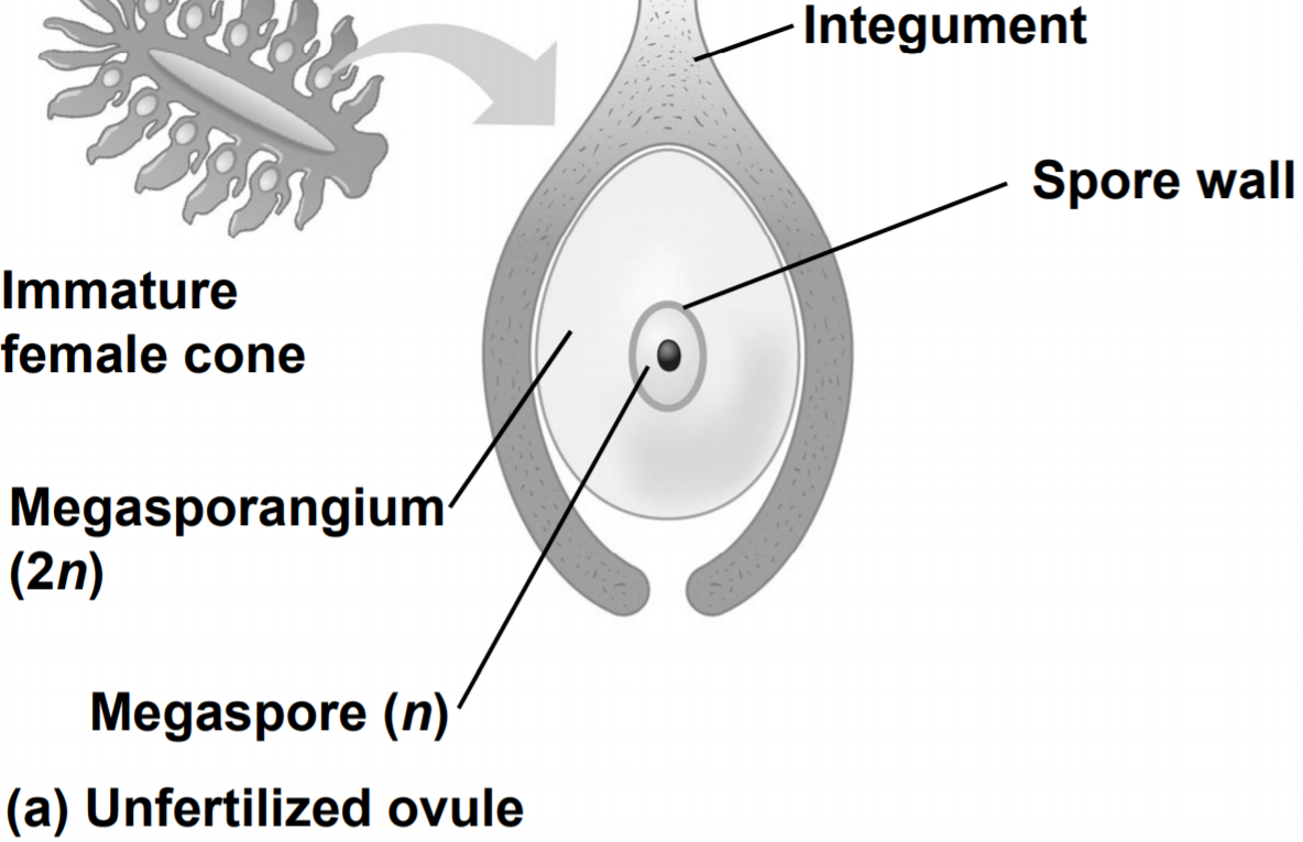 An unfertilized gymnosperm ovule is made up of integument, megasporanium, and megaspore. The female gametophyte develops from the megaspore and produces egg(s).
