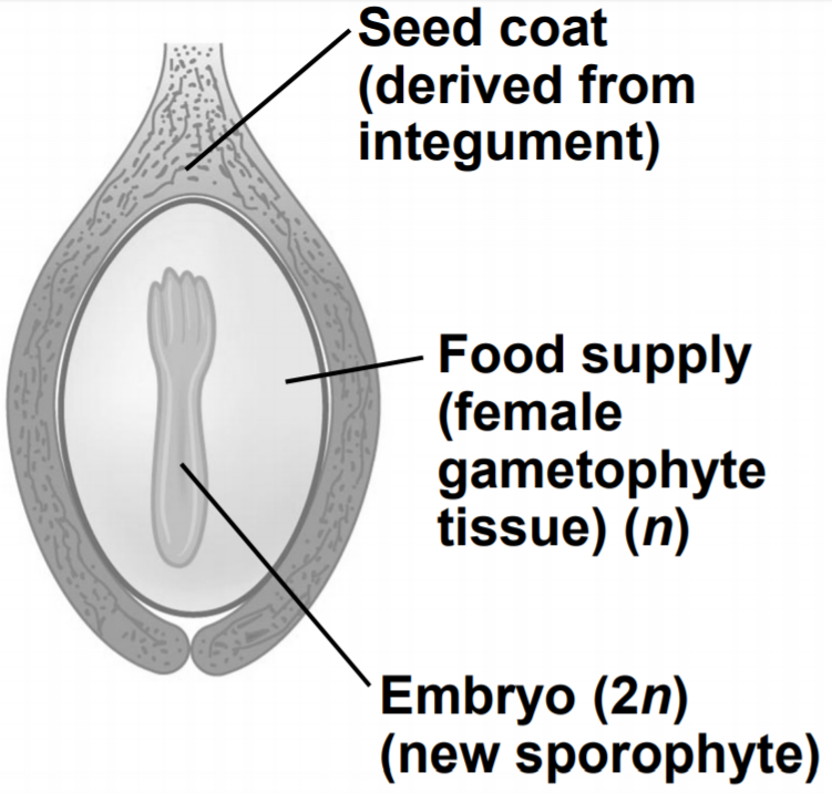 After germination and fertilization, a gymnosperm ovule develops into a _____ which consists of the _______ (gameto/sporophyte) embryo, its food source, and a ___________.