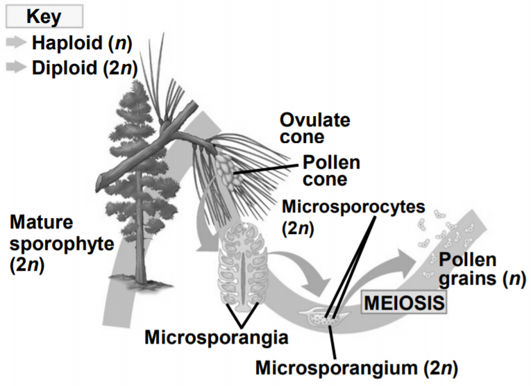 Microsporocytes divide by meiosis producing haploid microspores, wh dev into pollen grains.