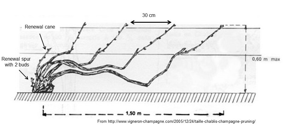 or Chablis vine training- cordon trained, cane pruned. 3-5 permanent arms, trained vertically