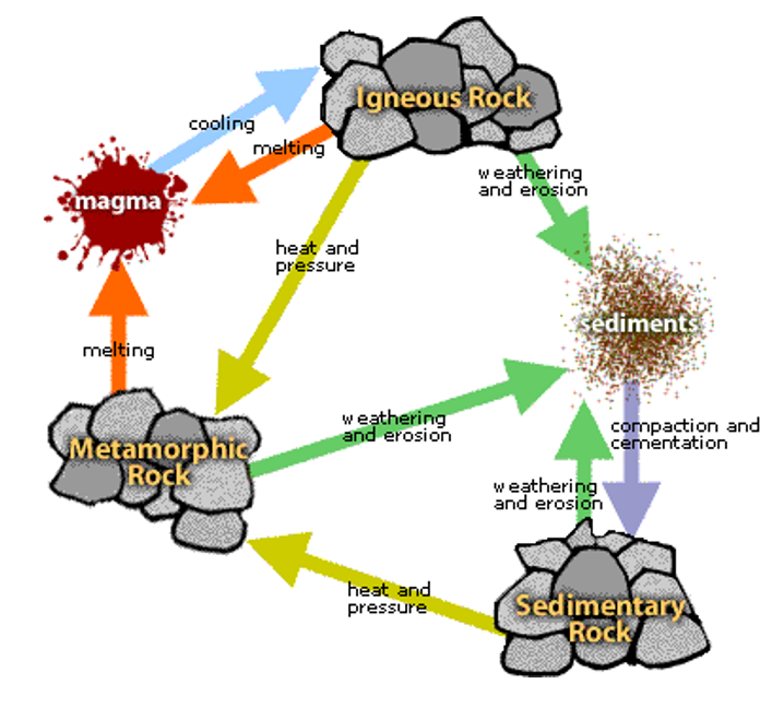 The rock cycle shows the changes between the three rock types (igneous, sedimentary and metamorphic) and the processes causing these changes.