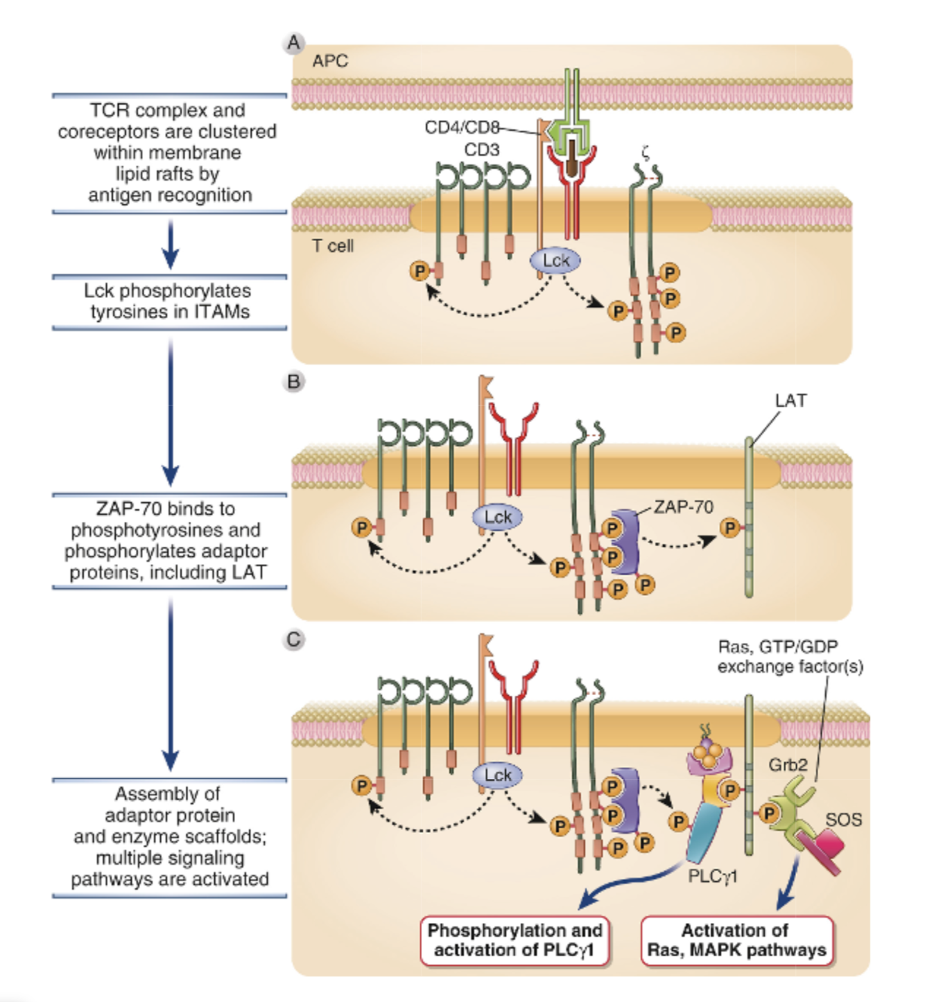 basically turns on (phosphorylates) the zeta and CD3 proteins by way of their ITAMs