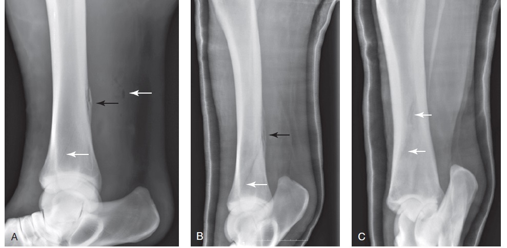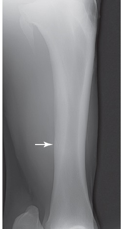 Figure 100-1. A craniolateral–caudomedial oblique radiographic view of the tibia showing the periosteal and endosteal callus (arrow) that accompanies a caudolateral tibial stress fracture.