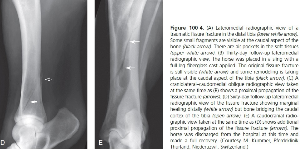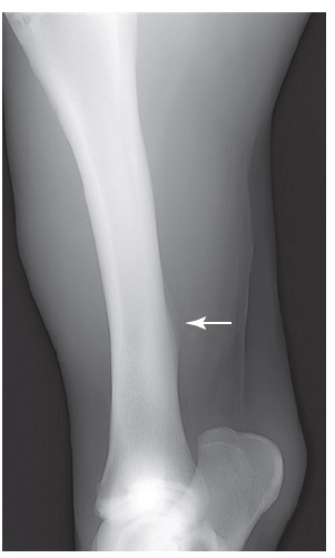 Figure 100-2. A craniolateral-caudomedial oblique radiographic view of a tibia with a midtibial stress fracture. The stress fracture can actually be seen in this horse (arrow), which is unusual because callus normally obscures the fracture.