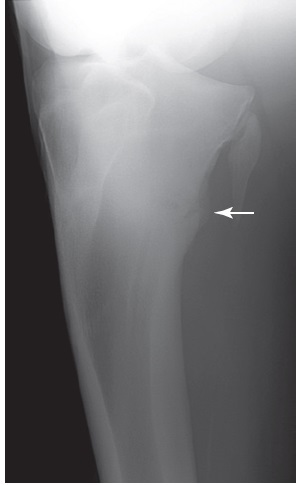 Figure 100-3. A craniolateral–caudomedial oblique radiographic view of the proximal tibia, which shows a chronic stress fracture of the proximal caudal tibia with associated callus (arrow).