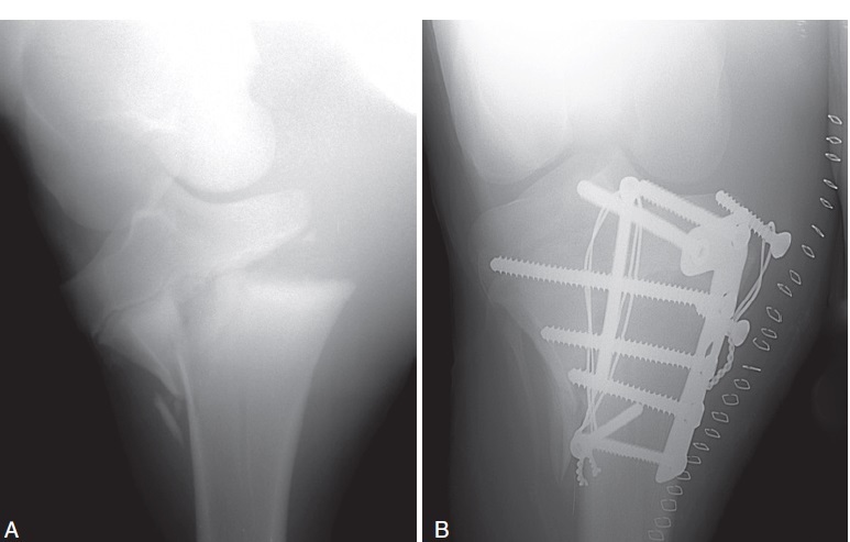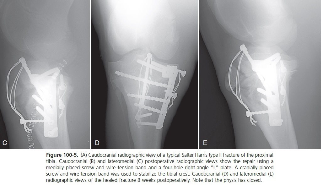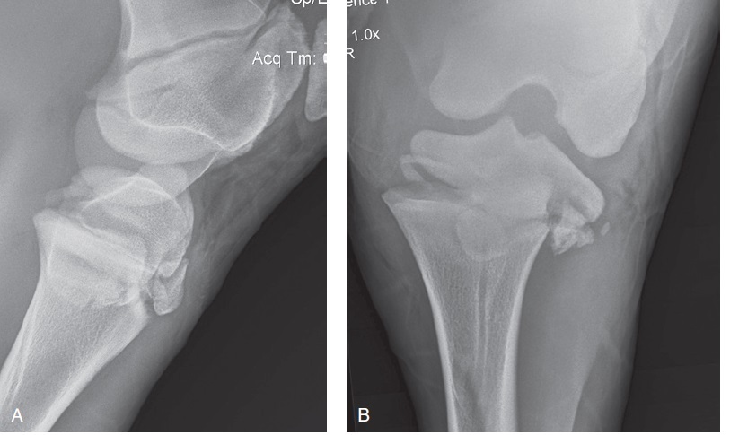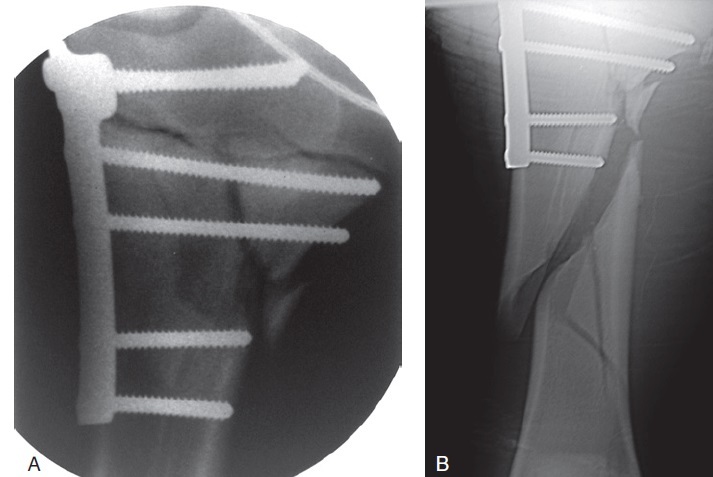 Figure 100-7. (A) A caudocranial intraoperative fluoroscopic view of a proximal tibial physeal fracture repaired with a four-hole T-plate. This fracture was more severe than a routine proximal tibial physeal fracture and required a more involved fixation. The metaphyseal component is comminuted and extends more than half the width of the bone. In addition, there is only one screw that is anchored in healthy bone distal to the comminuted fracture. This fracture probably required two implants and more distal fixation to resist the biomechanical instability the comminution created. (B) The caudocranial follow-up radiograph taken the next day because the foal was non–weight bearing on the limb. A catastrophic bone failure occurred during the night. The fracture initiated at the distal end of the original fracture and spiraled distally, leading to catastrophic failure of the bone. The owner did not want to proceed with treatment and the foal was humanely destroyed.