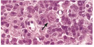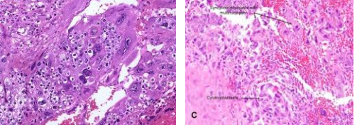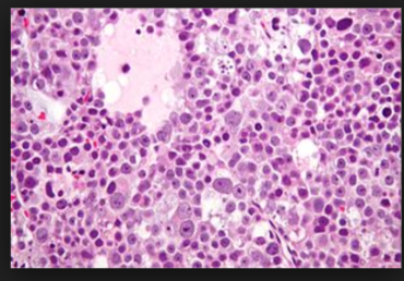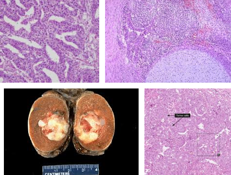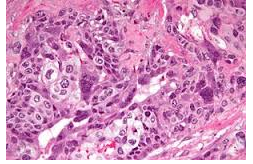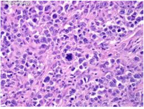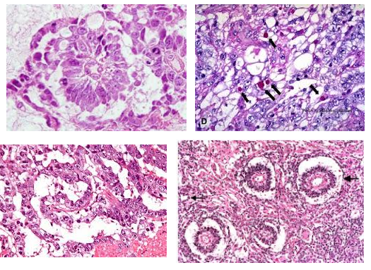 Malignant tumor comprised of immature, primitive cells that may produce glands and form a hemorrhagic mass with necrosis (aggresive with early heme spread)