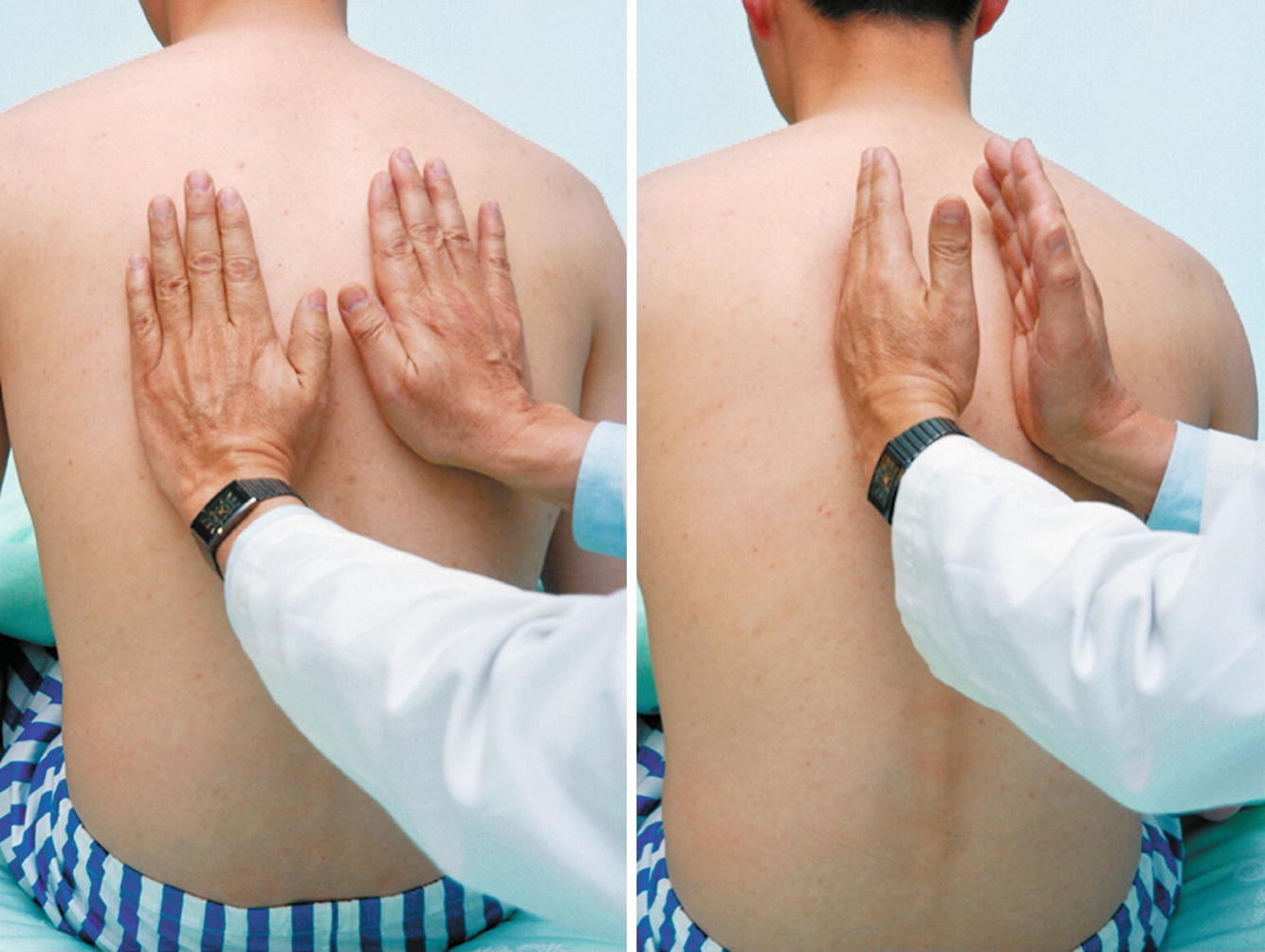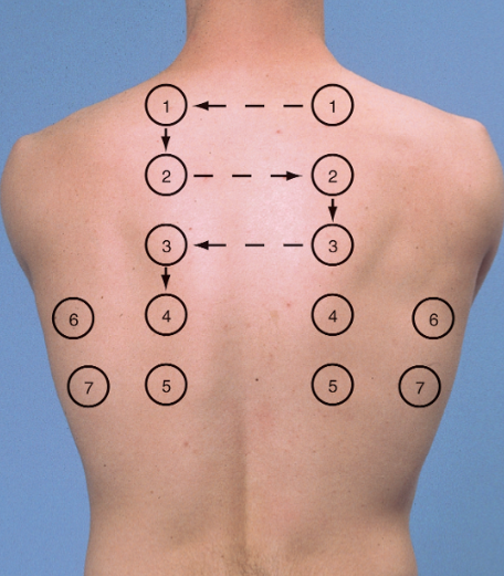 place hands on pt’s back level with T9-10 (or on anterior chest)