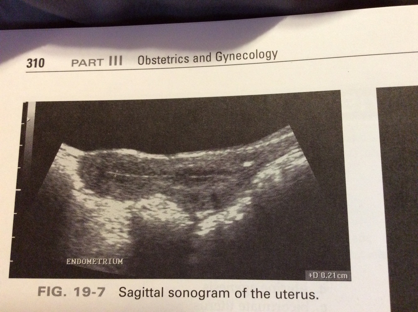 b: Only the functional layer (echogenic) is included when measuring endometrial thickness. The hypoechoic basal layer or fluid within the endometrium cavity is not included when measuring the thickness of the endometrium.