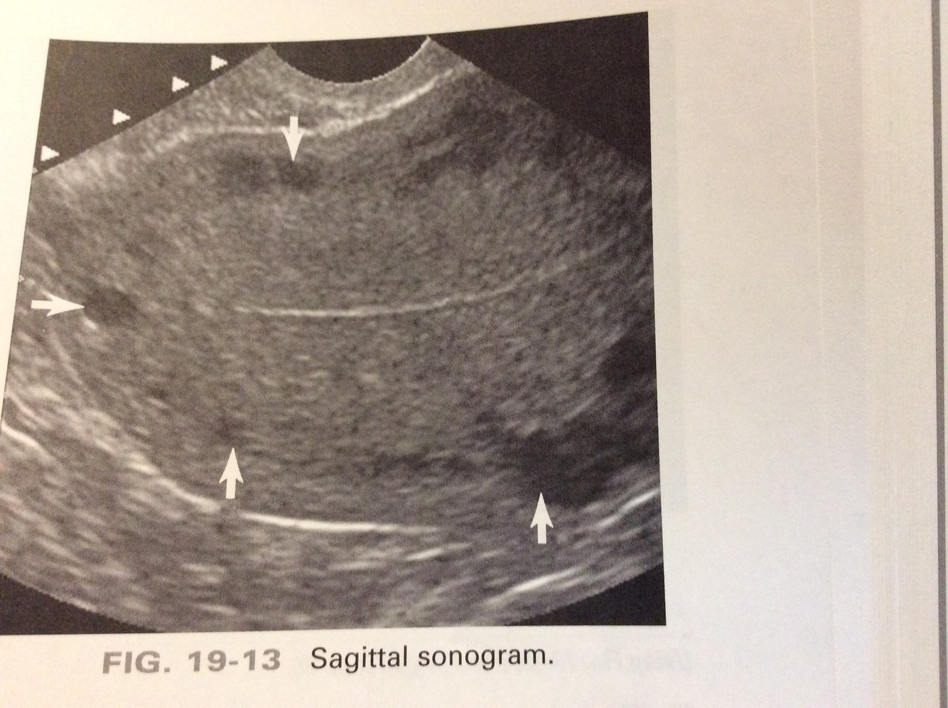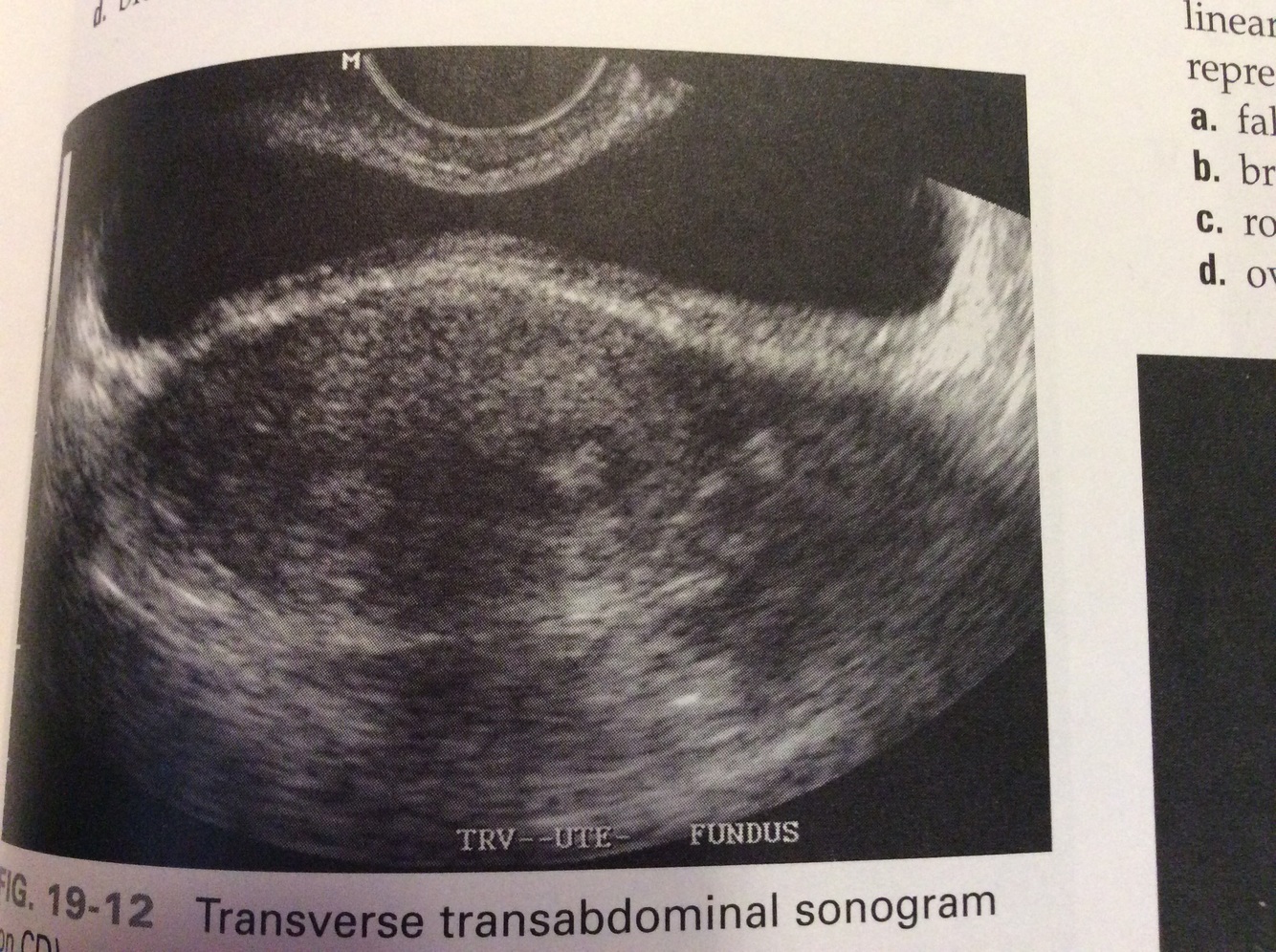 c: Evenly spaced, hypoechoic or anechoic, circular structures identified in the outer portion of the myometrium most likely represent arcuate veins. Uterine arteries are located in the broad ligament lateral to the uterus.