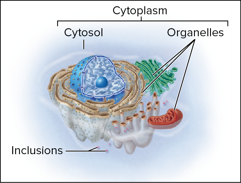 Cytoplasm is a general term for all cellular contents located between the plasma membrane and the nucleus. The three components of the cytoplasm are cytosol (a viscous fluid), inclusions (nonfunctional, temporary structures that store cellular products), and organelles (tiny structures that perform specific cellular functions).