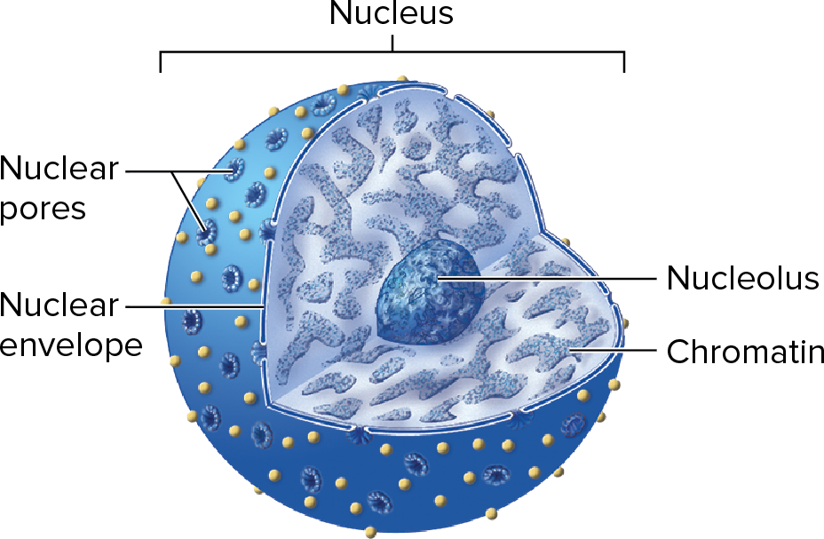 Surrounded by double membrane nuclear envelope (each membrane is a phospholipid bilayer); contains nucleolus and chromatin