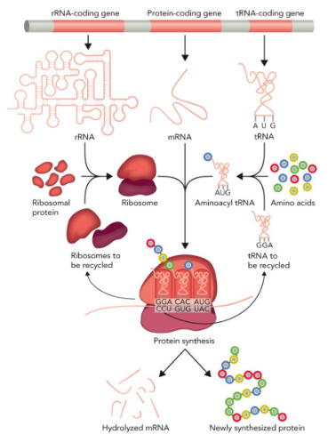 rRNA: Consitutes ribosome, makes proteins (machinery)