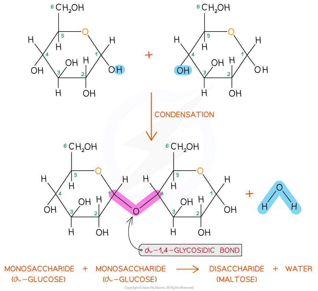 The formation of a glycosidic bond by condensation between two monosaccharides (glucose) to form a disaccharide (maltose)