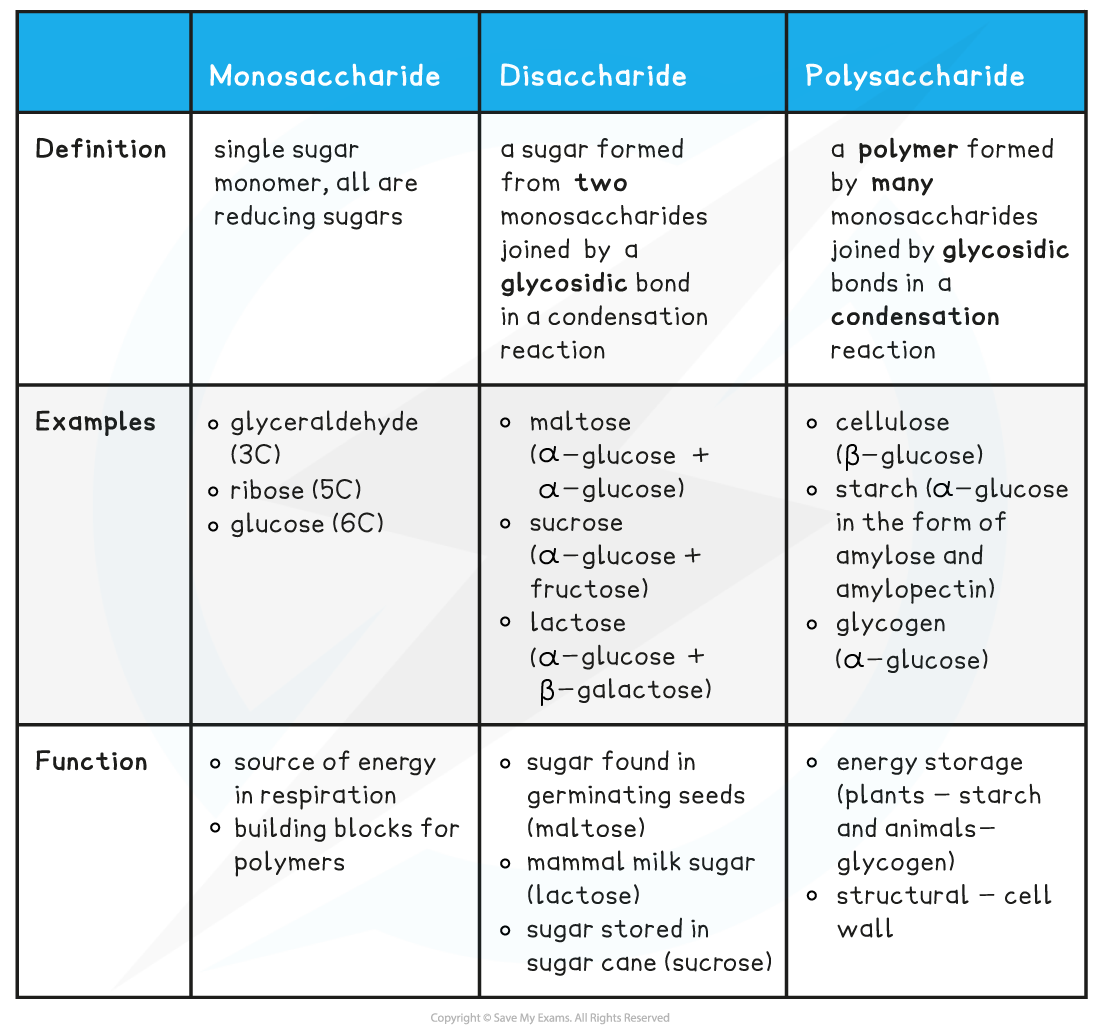- Function: sugar found in germinating seeds(maltose), mammal milk sugar(lactose(, sugar stored in sugar cane (sucrose