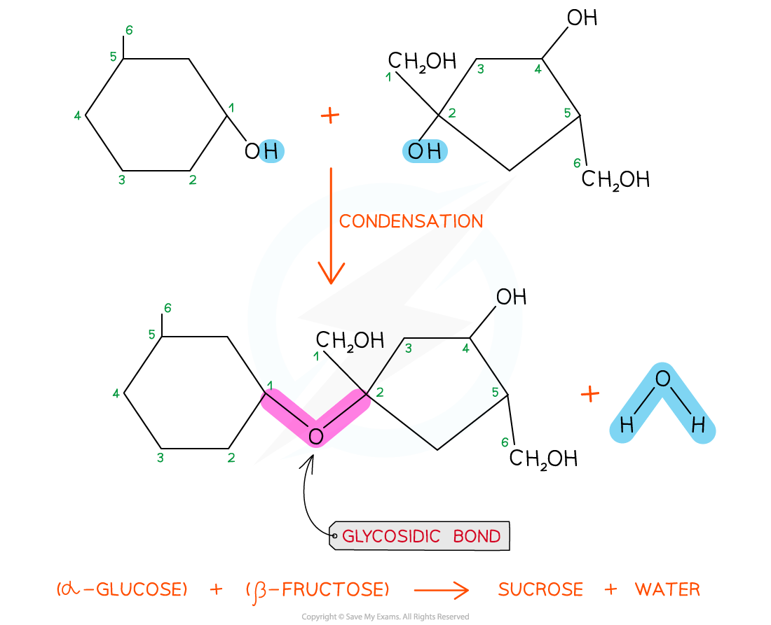 - examples: maltose(a-glucose + a-glucose), sucrose(a-glucose + fructose), lactose (a-glucose + B-galactose)