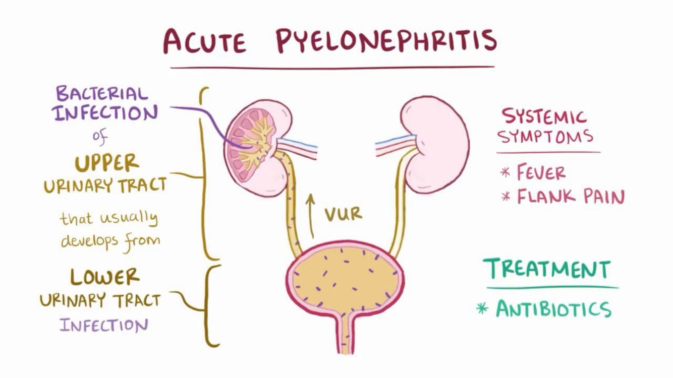 (UTI ascends up ureter into kidney)
