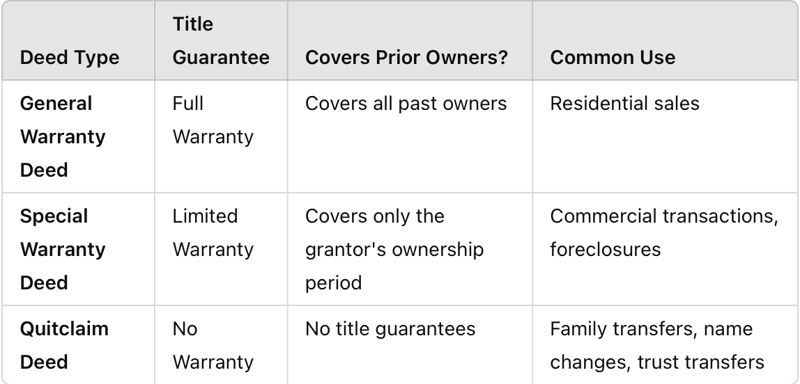 A General Warranty Deed guarantees the title is free from defects throughout the property’s history, while a Special Warranty Deed only covers defects occurring during the seller’s ownership.