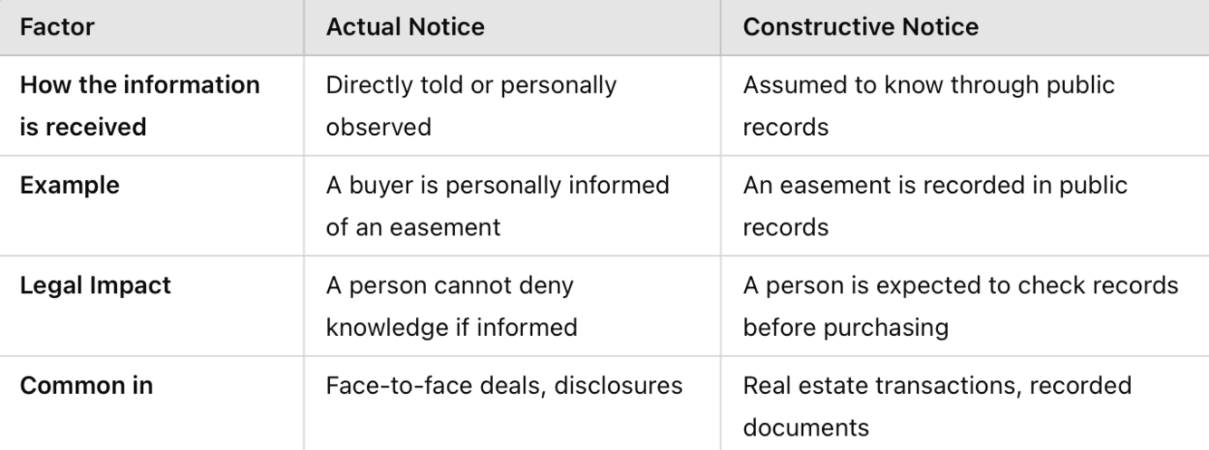 Actual Notice means a party has direct knowledge of a legal claim or property interest, whereas Constructive Notice applies once a document is recorded in public records.
