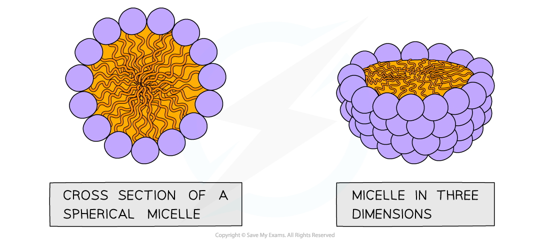 -form spheres with the hydrophilic phosphate heads facing out towards the water and the hydrophobic fatty acid tails facing in towards each other-ball-like structures called micelles -Sheet-like structures called bilayers