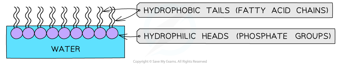 -a single layer with the hydrophilic phosphate heads in the water and the hydrophobic fatty acid tails sticking up away from the water -This is called a phospholipid monolayer