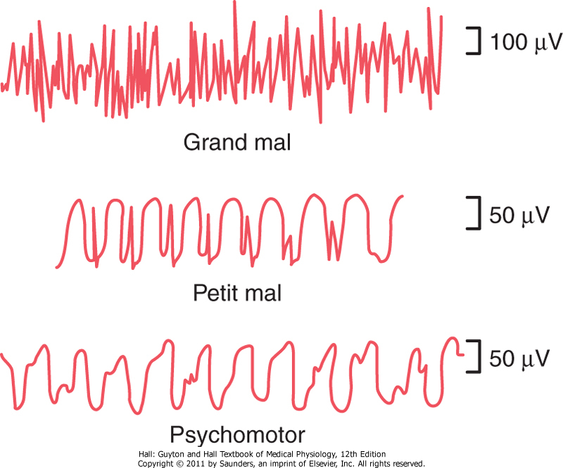 What are the brain waves like in the grand mal, petite mal, and focal epilepsy?