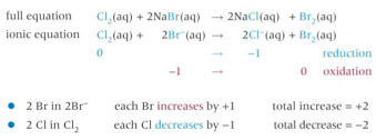 Give the full and ionic equation of the redox reaction between aquesous solutions of chlorine and sodium bromide. What is the change in oxidation number.