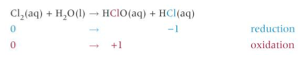 When small amounts of chlorine are added to water, a disproportionation reaction takes place. For each chlorine molecule, one chlorine atom is oxidised and the other chlorine atom is reduced.