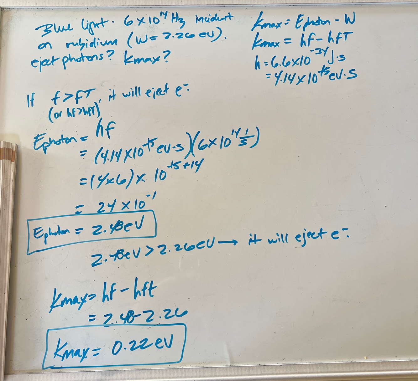 If the frequency of the incident photon is greater than the threshold frequency, then an electron will be ejected, and the maximum kinetic energy of the ejected electron will be equal to the difference between hf and hfT (the energy of the electron and the work function).