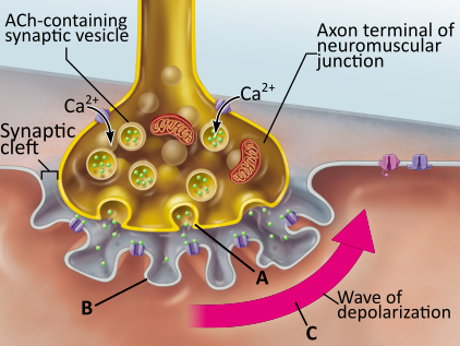 C. release of acetylcholine from axon terminals at the neuromuscular junction